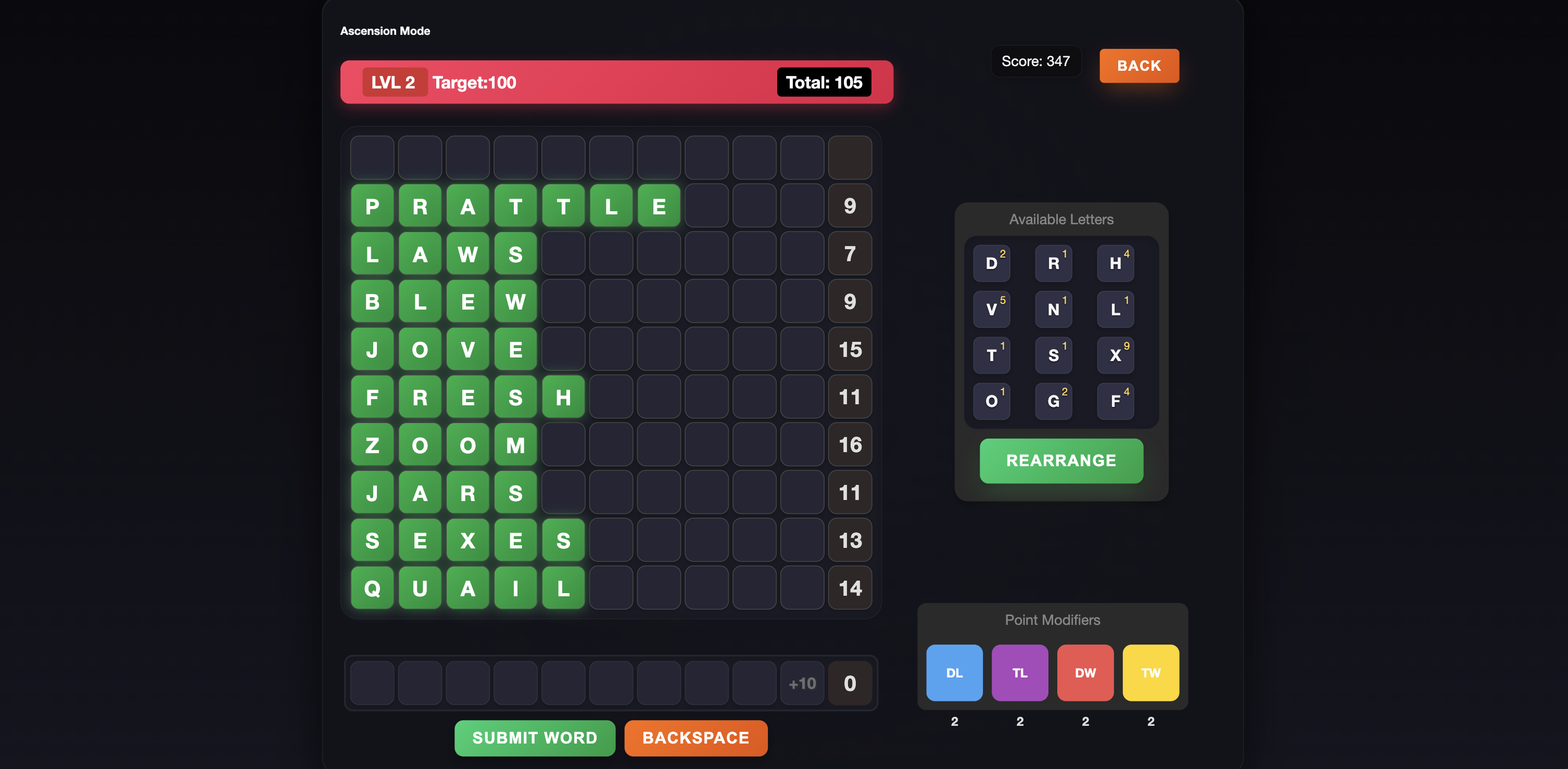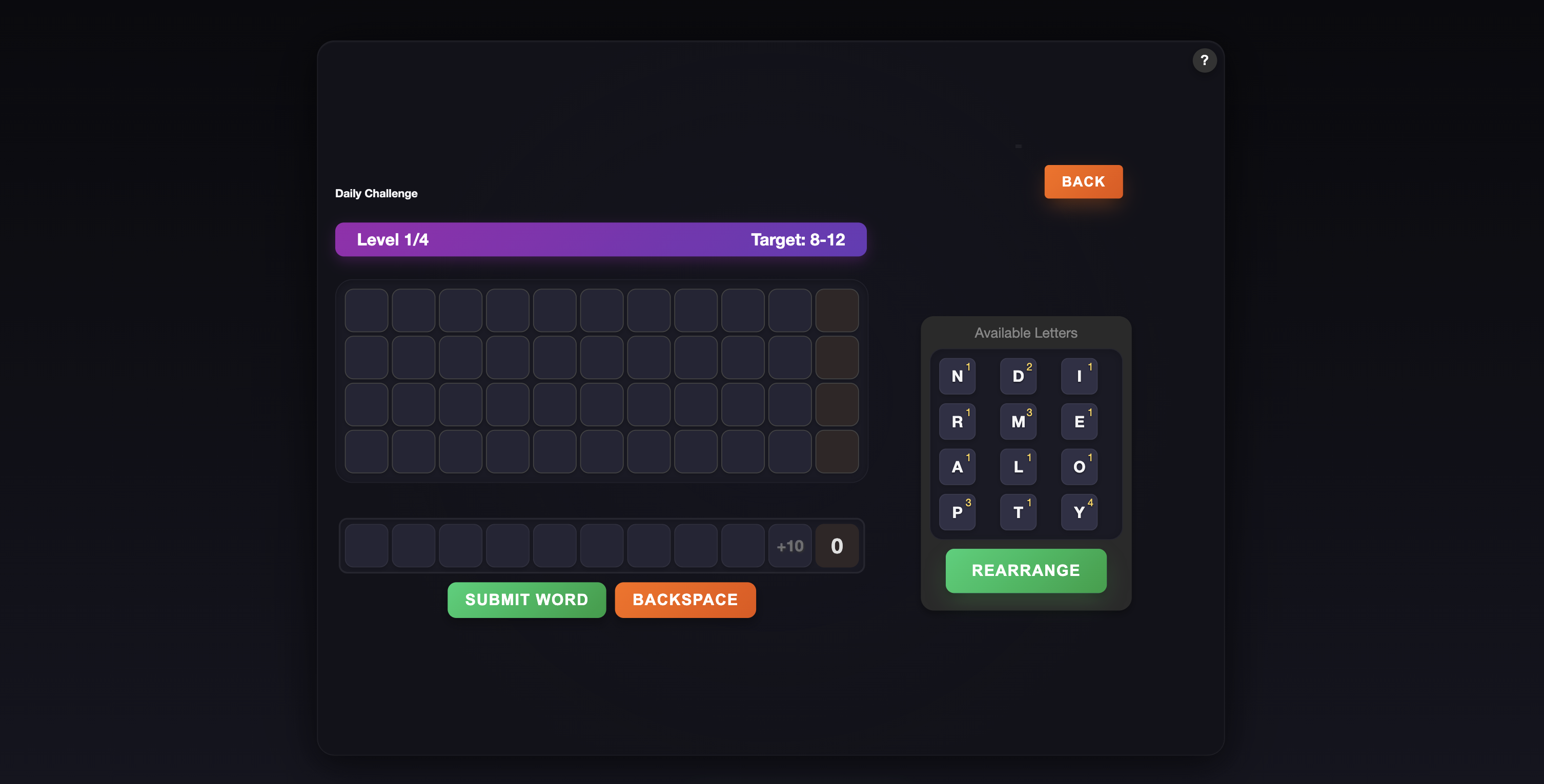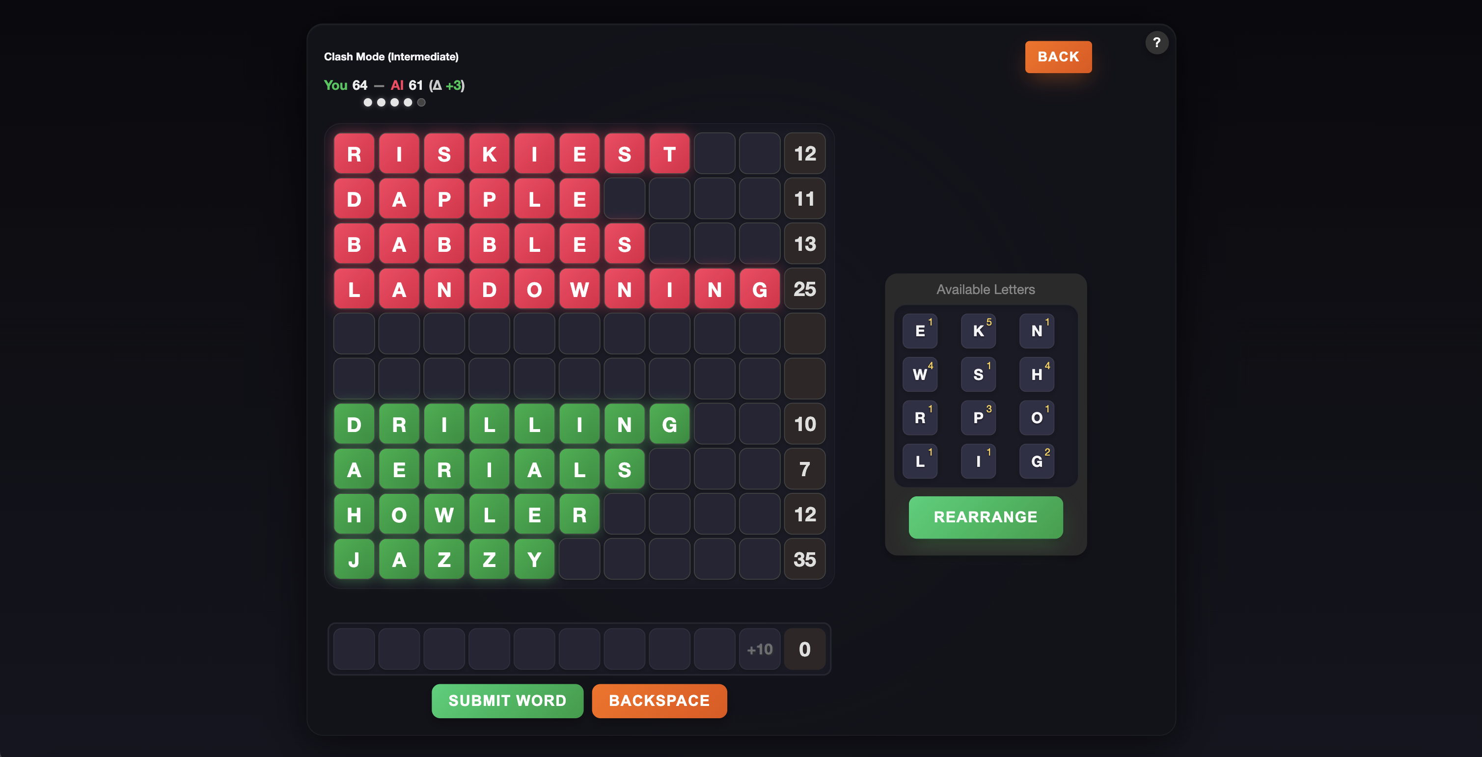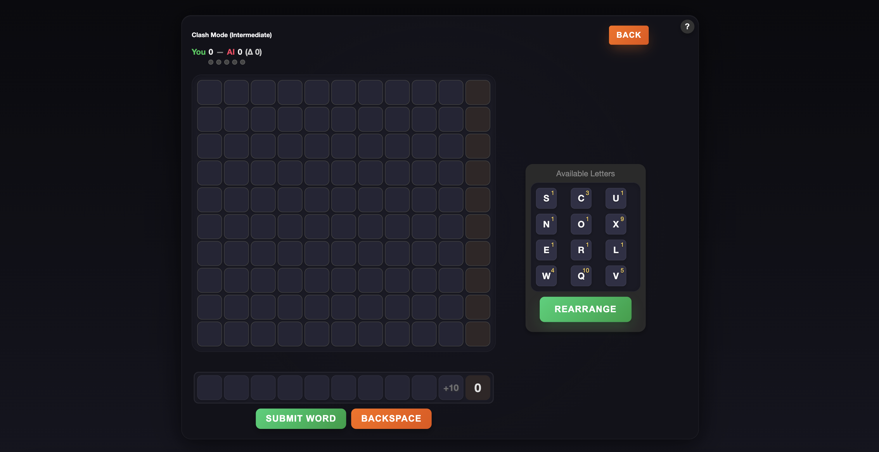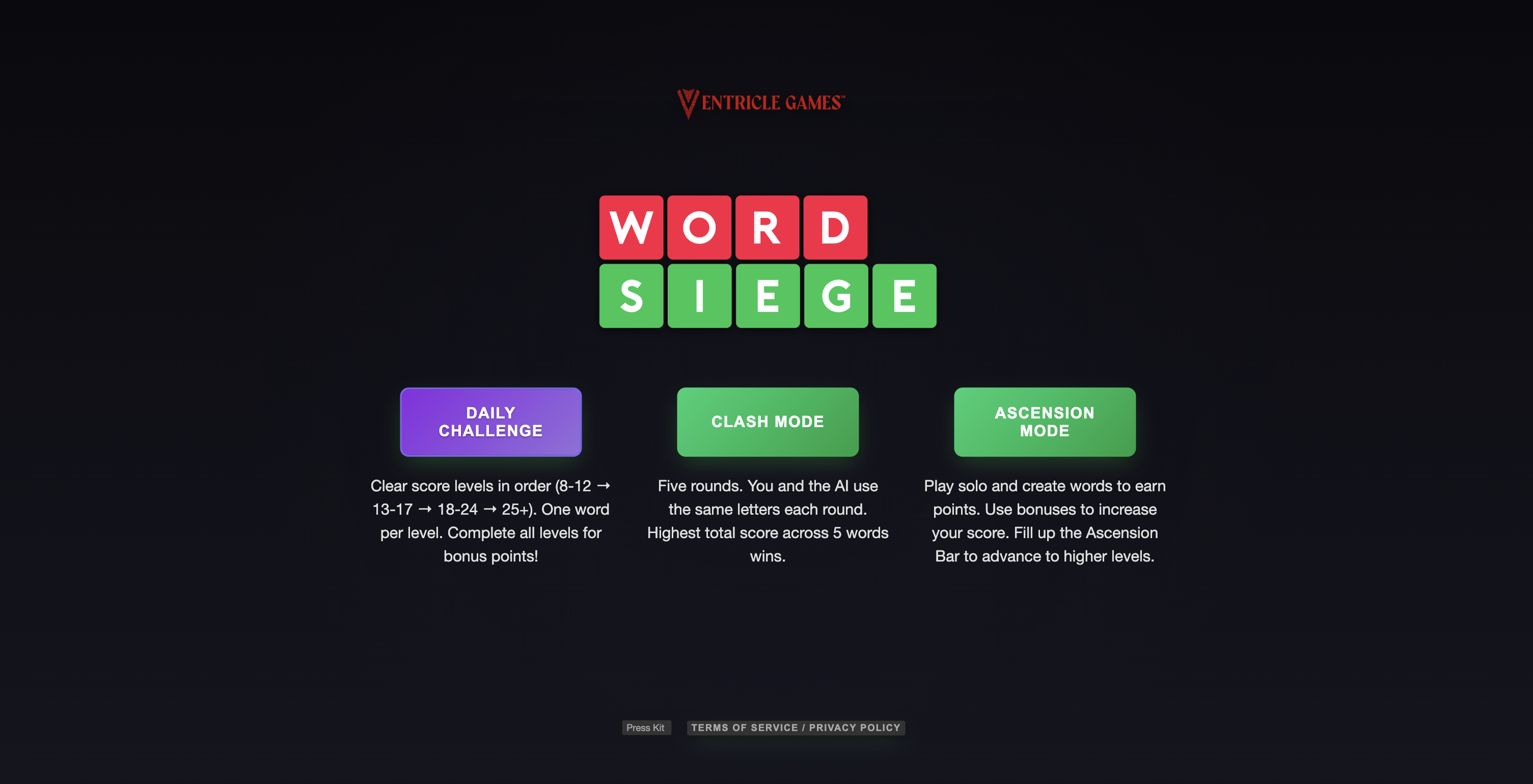 Word Siege is a fast, strategic word game. Build words across a tactical grid and choose among three modes: Clash Mode (face off against an AI across Easy, Intermediate, and Hard — play five rounds from shared letters; highest total wins), Ascension Mode (solo score progression with bonuses), and the Daily Challenge (a structured 4-level run with escalating word requirements). Word multipliers (DL, TL, DW, TW), modern UI polish, and quick shareable results make it easy to play and easy to spread.